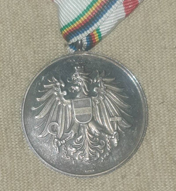 tragbare silberne Verdienstmedaille (AE versilbert) am Original Dreiecksband und im originalen Etui, leicht gedunkelt mit schöner Patina.